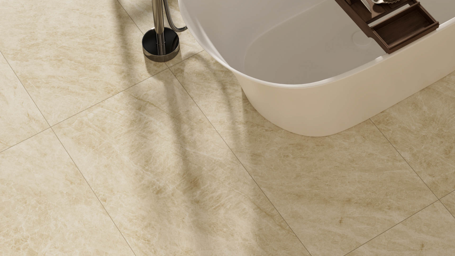 Compare this same residential bathroom using 12”x24” tiles on the walls and floors, in contrast to larger 24”x48” tiles.