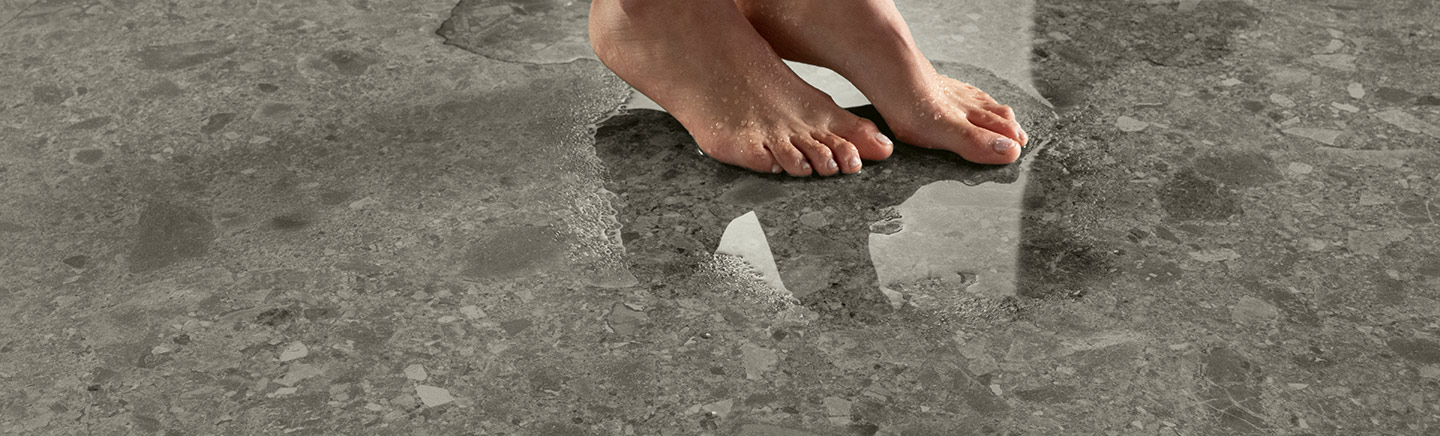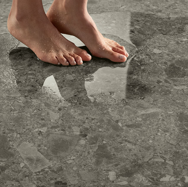 The Sensitech surface innovative technology is achieved by applying microparticles to the porcelain tile. These particles fill the cavities in the surface, leaving the peaks unaffected, and thus preserving the ability to generate friction. At the same time, the application makes the ceramic surface smoother and more homogeneous. Thanks to this application, it is also more pleasant to the touch and easier to clean.